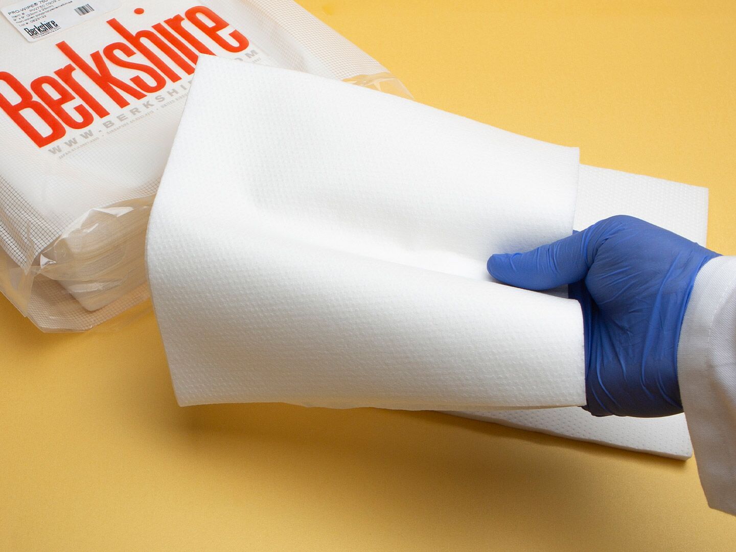 Berkshire Pro-Wipe® 750 is a solvent-resistant wipe with exceptional absorbency. It makes an excellent upgrade for industrial wipe users. It is composed of a layer of cellulose bonded between two outer layers of polypropylene. This combination of properties provides Pro-Wipe® 750 with exceptional cleanliness, absorbency, and chemical resistance to strong solvents.