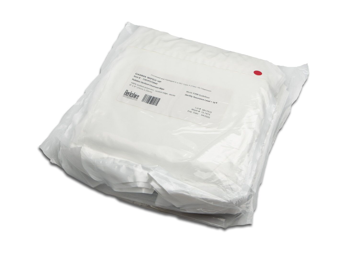 Berkshire Gamma Wipe®-VP is a sterile sealed-edge, cleanroom laundered 100% polyester knit wipe for ISO Class 3 and above controlled environments. Each package is gamma irradiated sterile to a 10-6 Sterility Assurance Level. The Gamma Wipe®-VP offers critically low particle, fiber, ion, and extractable levels as well as abrasion resistance and absorbency. The wipe is chemically compatible with common cleaning and disinfecting solutions, including isopropyl alcohol, phenols, bleaches, and quaternary ammonium compounds.