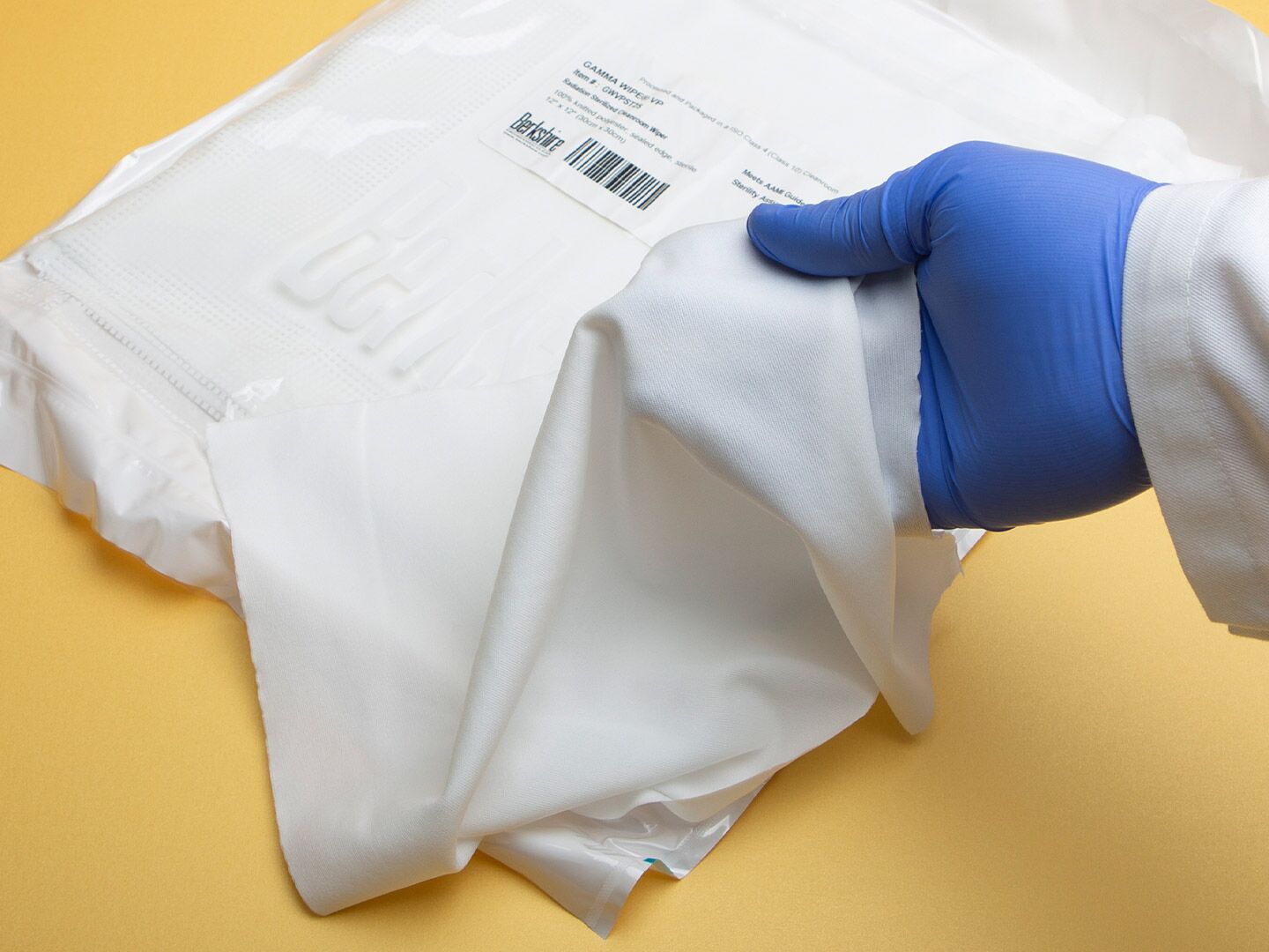Berkshire Gamma Wipe®-VP is a sterile sealed-edge, cleanroom laundered 100% polyester knit wipe for ISO Class 3 and above controlled environments. Each package is gamma irradiated sterile to a 10-6 Sterility Assurance Level. The Gamma Wipe®-VP offers critically low particle, fiber, ion, and extractable levels as well as abrasion resistance and absorbency. The wipe is chemically compatible with common cleaning and disinfecting solutions, including isopropyl alcohol, phenols, bleaches, and quaternary ammonium compounds.