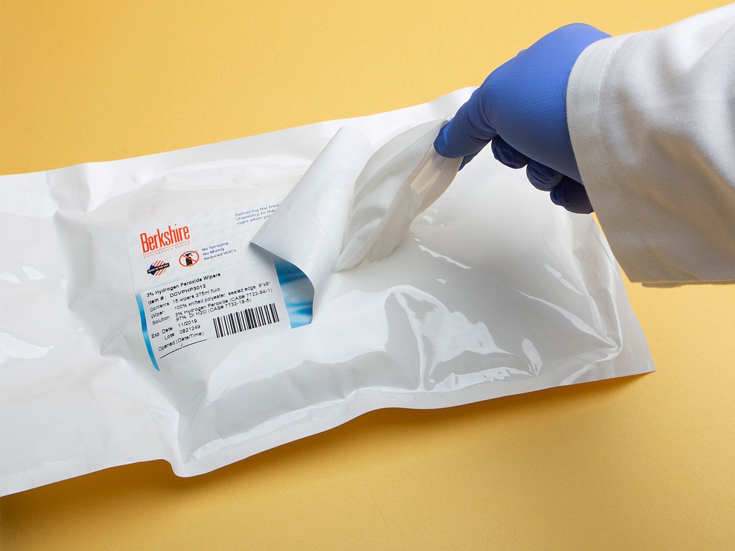 DuoClean® Hydrogen Peroxide Wipes provide convenience, consistency, and the disinfectant capabilities of hydrogen peroxide for cleaning a wide array of cleanroom surfaces. Featuring our patent-pending burstable pouch wet-to-dry technology focused on the operator in a scalable session format. This point of use solution provides added value by eliminating the need for spraying, mixing, measuring, storage, and buying bulk chemicals. In addition, DuoClean™ solves the problem facing many highly regulated industries that want the convenience of a pre-saturated disinfectant wipe which had traditionally been difficult to stabilize in pre-saturated formats due to highly reactivate oxidizing chemicals that can interfere with efficacy. At last, convenience and efficacy have been combined.