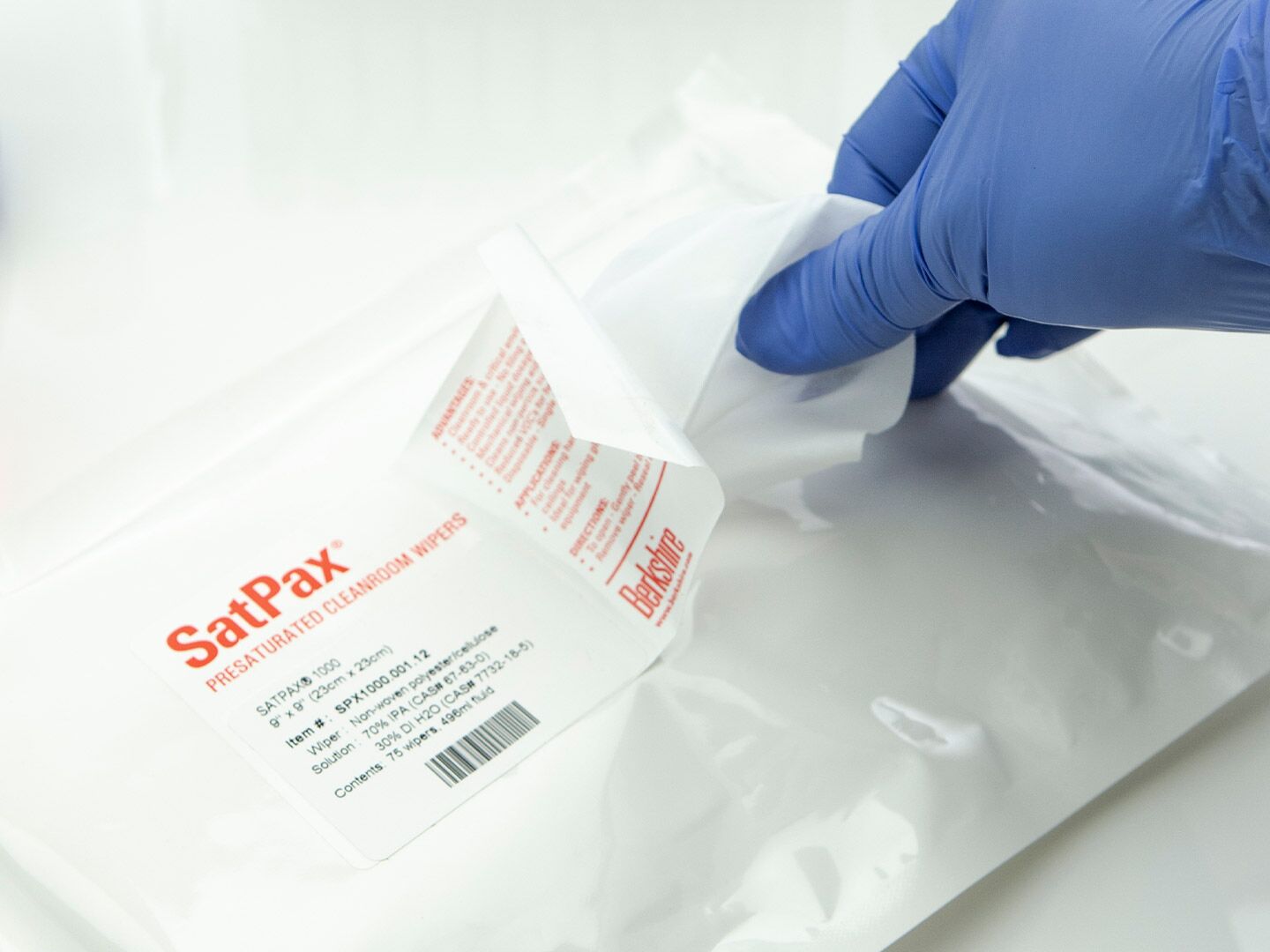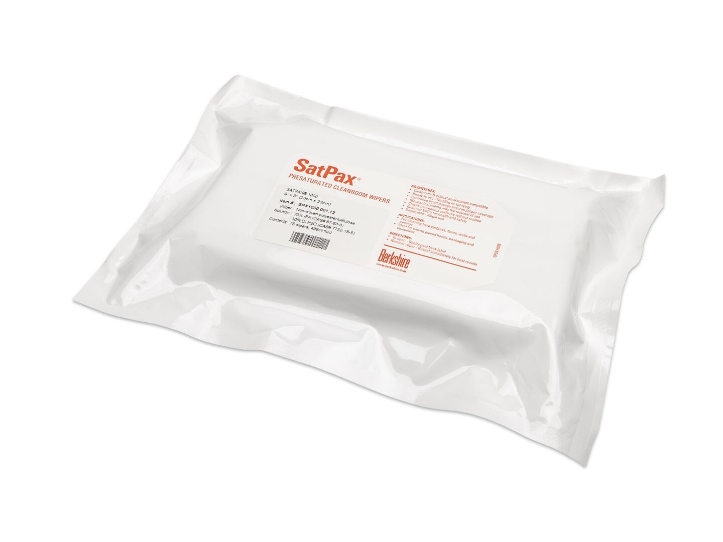 Berkshire SatPax® 1000 combines Durx® 670 nonwoven wipes (composed of a hydroentangled nonwoven blend of 55% cellulose and 45% polyester) with various saturation levels of isopropyl alcohol (IPA) and DI water. This pre-wetted wipe format provides a more cost-effective and easy-to-use solution compared to manual wetting of dry wipes, which requires bulk handling of messy solvents and maintenance of squirt bottles and results in inconsistent wetting and cleaning.