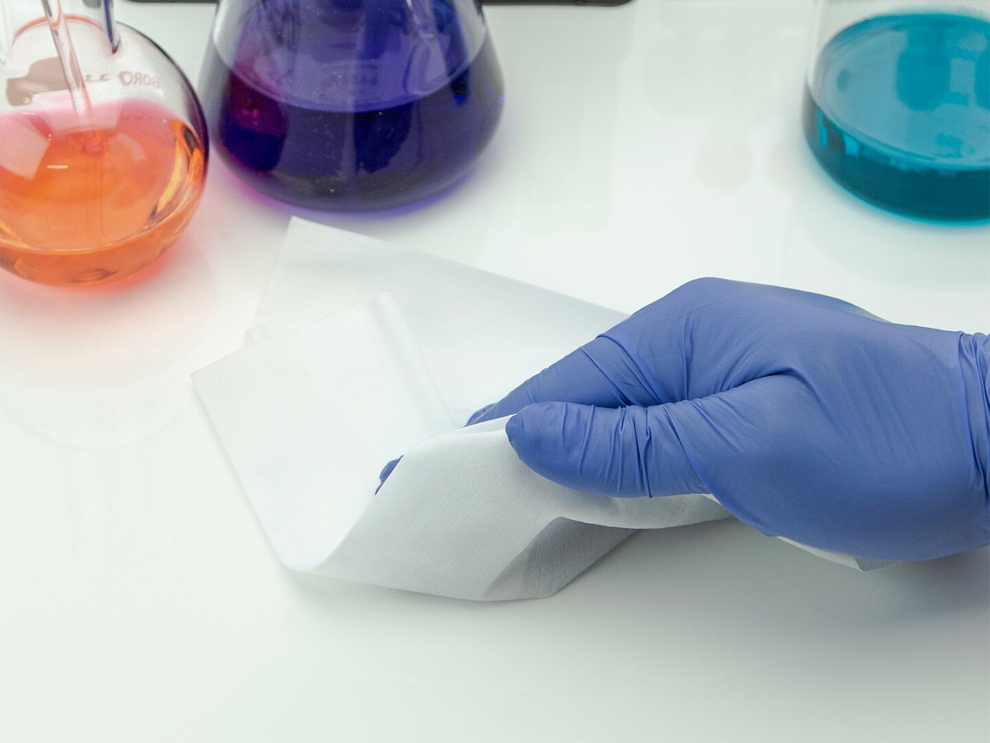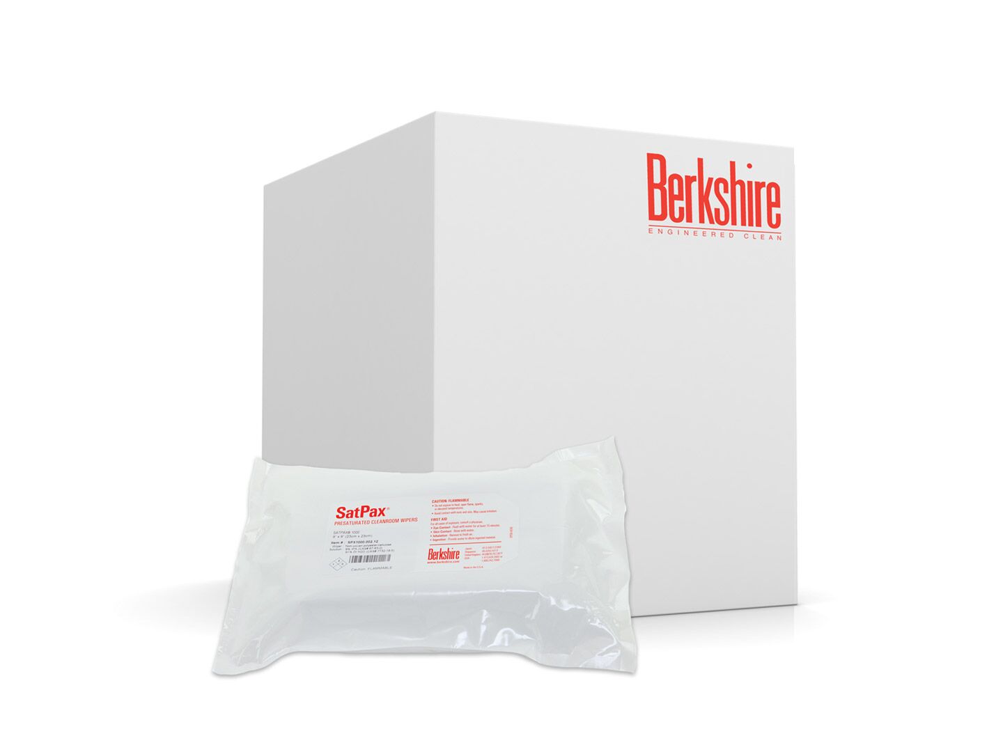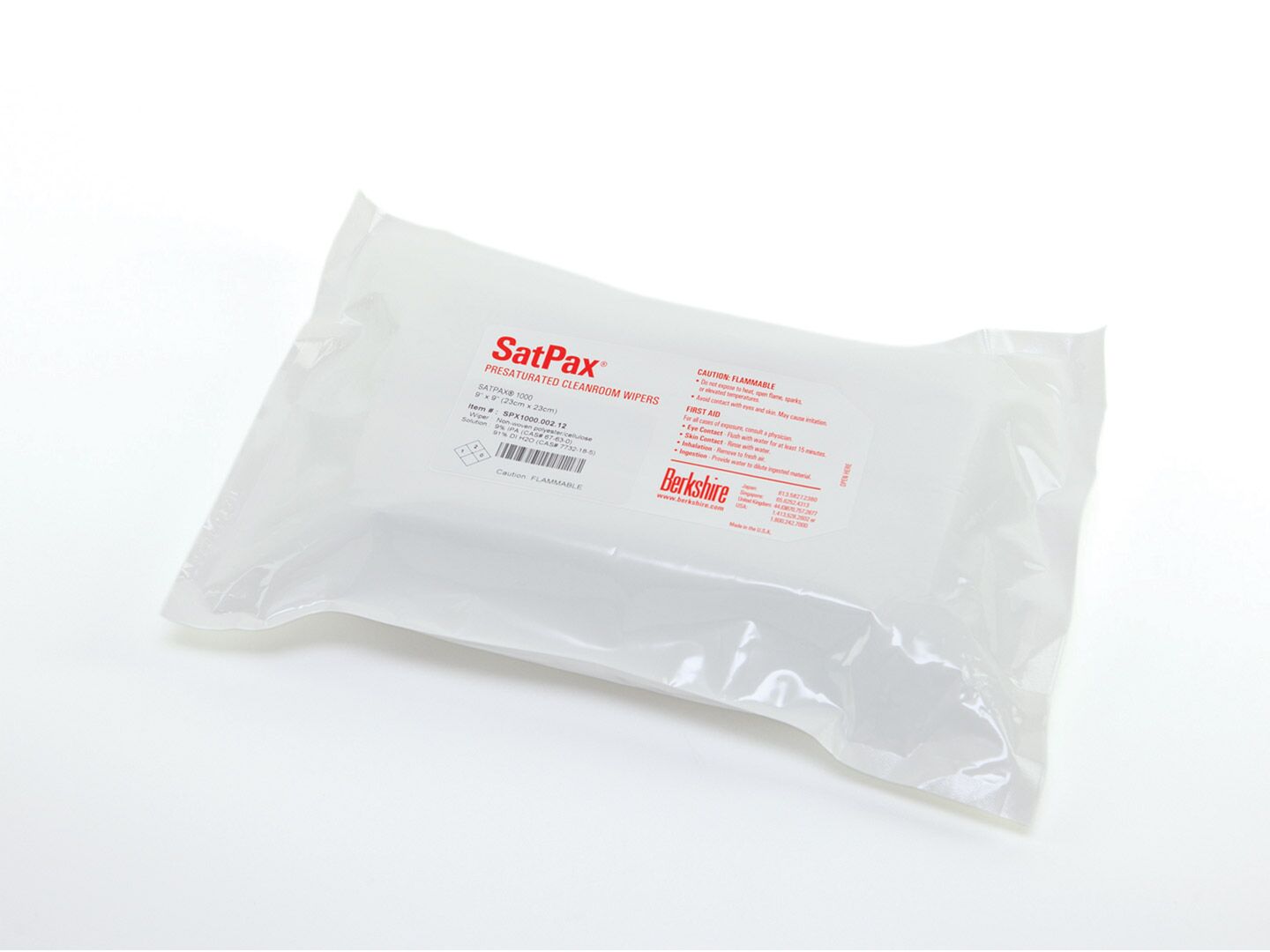 Berkshire SatPax® 1000 combines Durx® 670 nonwoven wipes (composed of a hydroentangled nonwoven blend of 55% cellulose and 45% polyester) with various saturation levels of isopropyl alcohol (IPA) and DI water. This pre-wetted wipe format provides a more cost-effective and easy-to-use solution compared to manual wetting of dry wipes, which requires bulk handling of messy solvents and maintenance of squirt bottles and results in inconsistent wetting and cleaning.