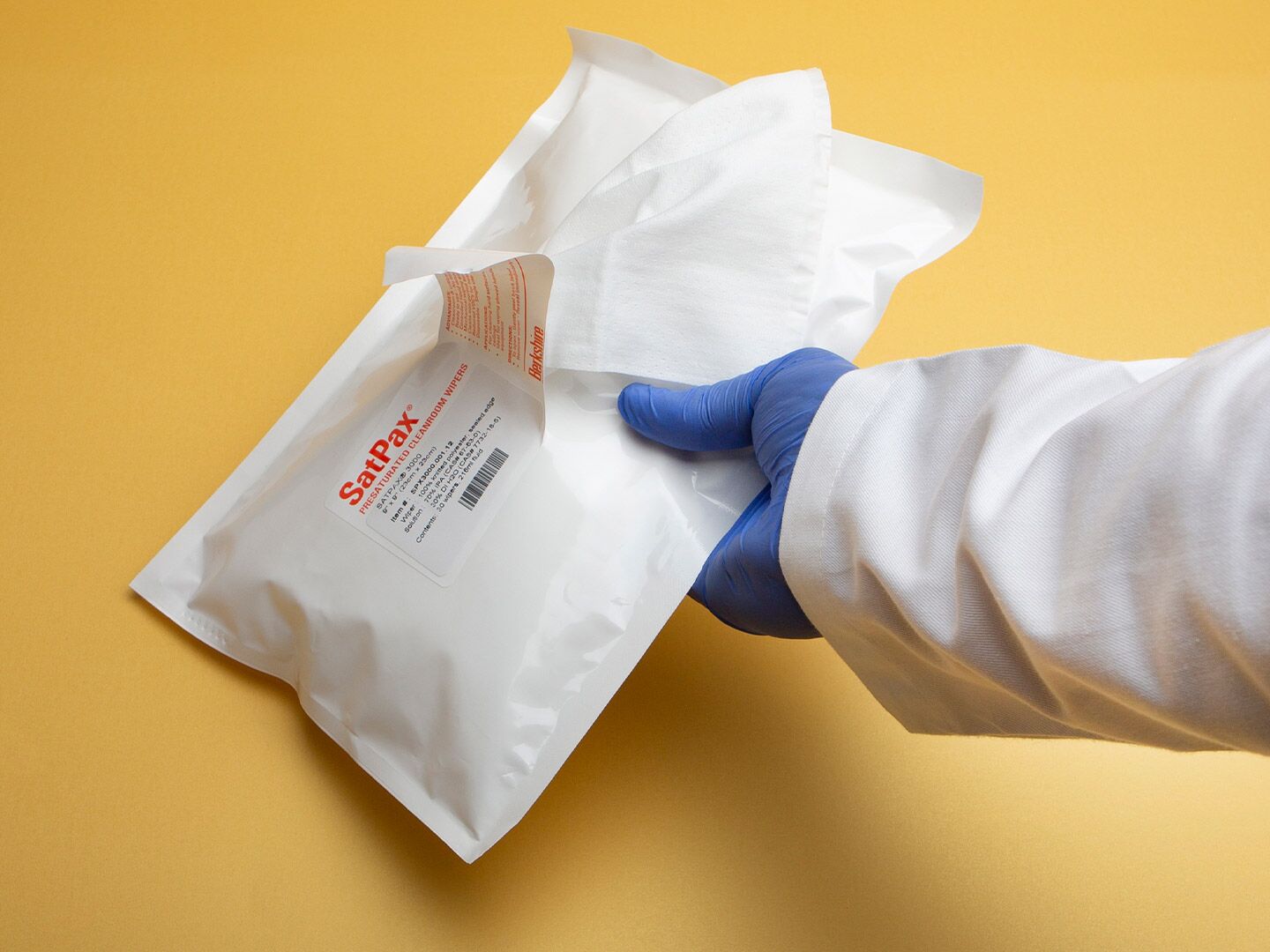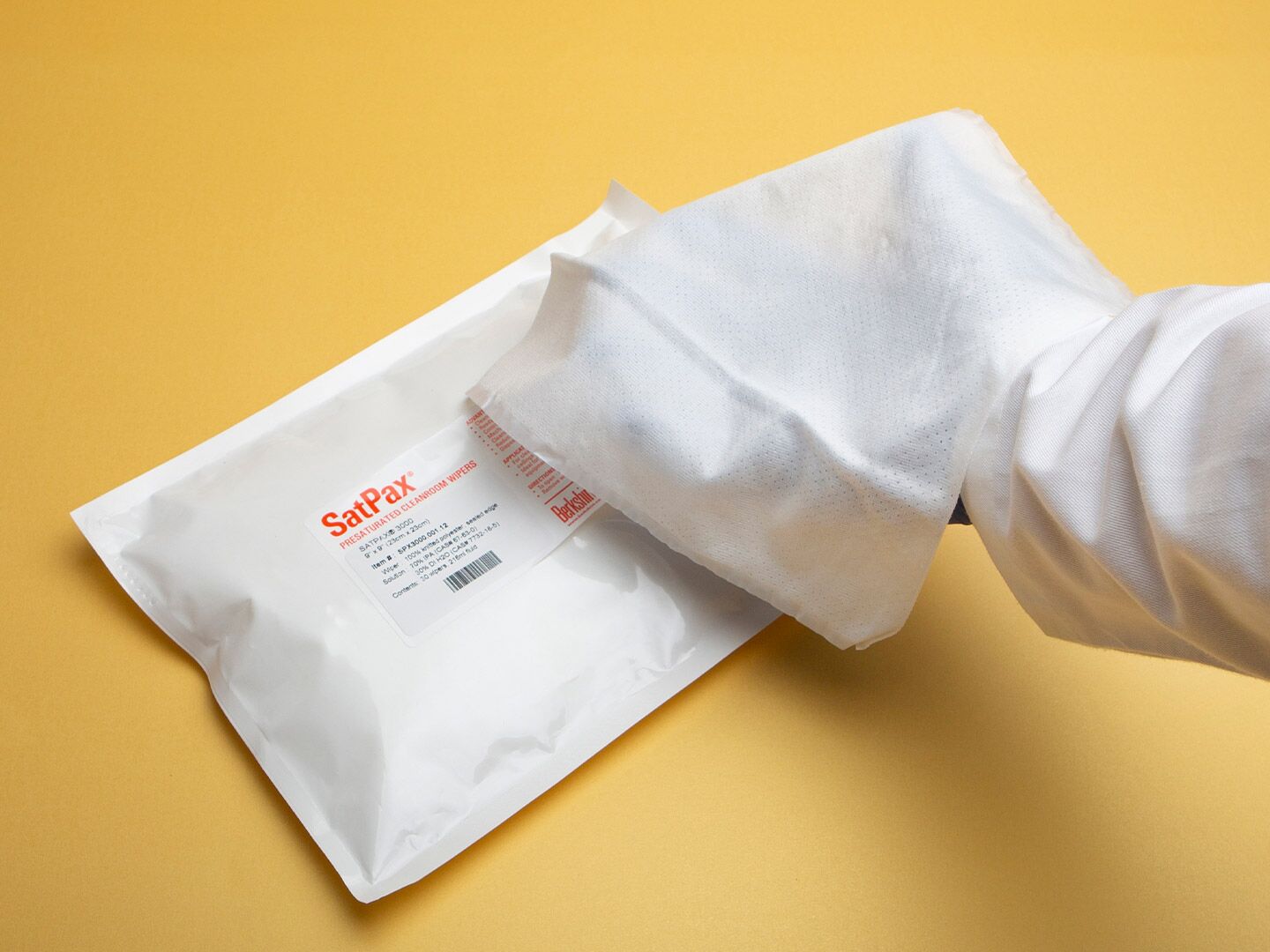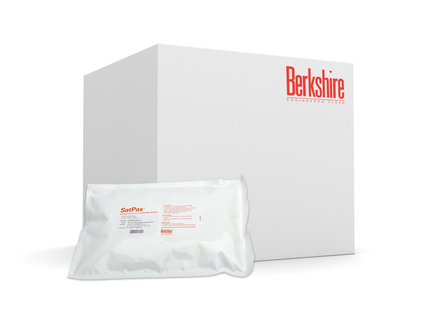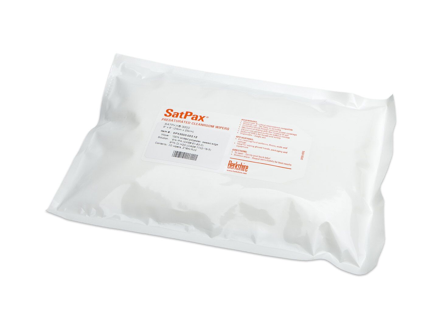 Berkshire SatPax® 3000 combines the UltraSeal® 3000 sealed-edge, cleanroom-laundered wipe (with two-ply pinsonic tubular construction) with various concentrations of isopropyl alcohol (IPA) — the SPX3000.001.12 contains a 70% IPA solution and the SPX3000.002.12 contains a 9% IPA solution. The cleanroom wipe is composed of 100% continuous filament polyester knit fabric. This pre-wetted format provides a more cost-effective and easy-to-use solution compared to the manual wetting of dry wipes, which requires bulk handling of messy solvents and maintenance of squirt bottles and results in inconsistent wetting and cleaning.