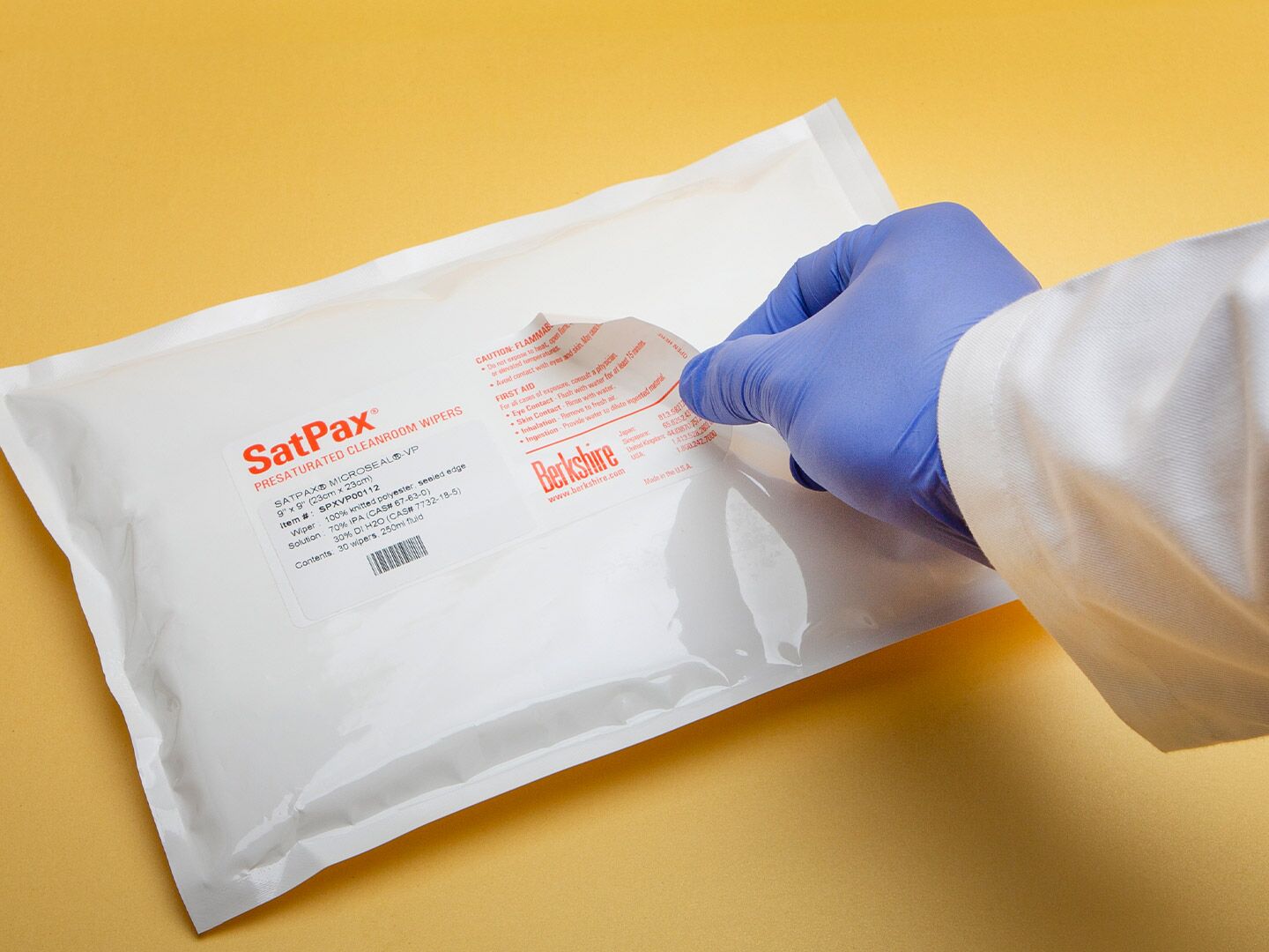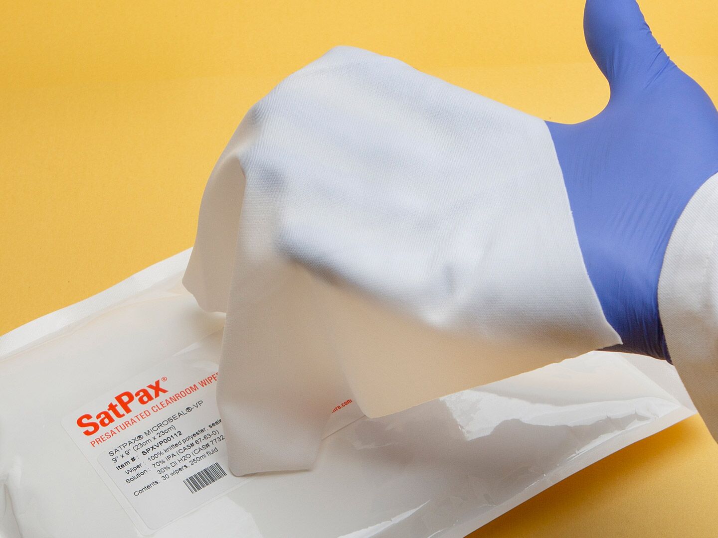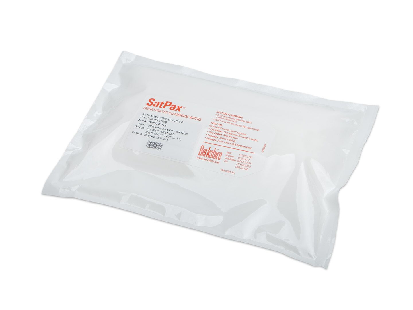SatPax® MicroSeal®-VP is an ultrasonically sealed edge cleanroom laundered wiper recommended for ISO Class 3 and above environments composed of 100% continuous filament polyester knit fabric. The wiper is pre-wetted with 70% IPA and 30% DI water. This combination of properties provides SatPax® MicroSeal®-VP with the highest level of cleanliness, abrasion resistance and chemical compatibility required for cleaning critical environments. The Pre-wetted format provides a cost effective and easy to use solution versus traditional bulk handling of solvents and maintenance of squirt bottles.