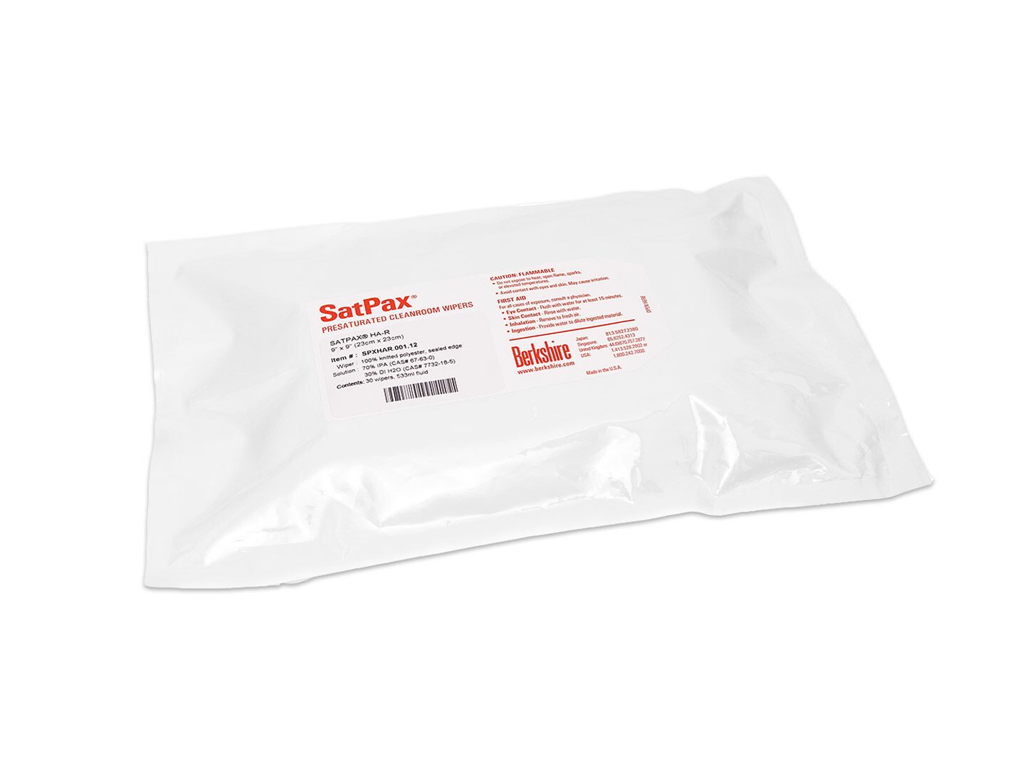 SatPax® HAR combines ValuSeal® -HA ultrasonically sealed edge cleanroom laundered wipes composed of 100% continuous filament polyester knit fabric wetted with 70% IPA / 30% DIW. This pre-wetted format provides a cost effective and easy to use solution versus traditional bulk handling of solvents, maintenance of squirt bottles and inconsistent wetting and cleaning associated with wetting a dry wipe during cleaning. A high solution saturation level of 65% makes SatPax® HAR Ideal for regulated applications or applications requiring higher solution levels delivered to the surface.